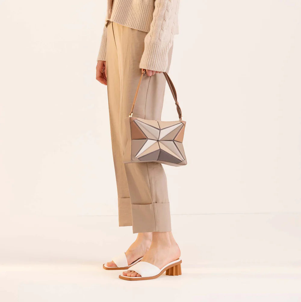 Bold geometry meets refined elegance. This sculptural star-panel crossbody bag features precision leather paneling, soft neutral tones, and a structured silhouette—designed to stand out while staying effortlessly wearable.